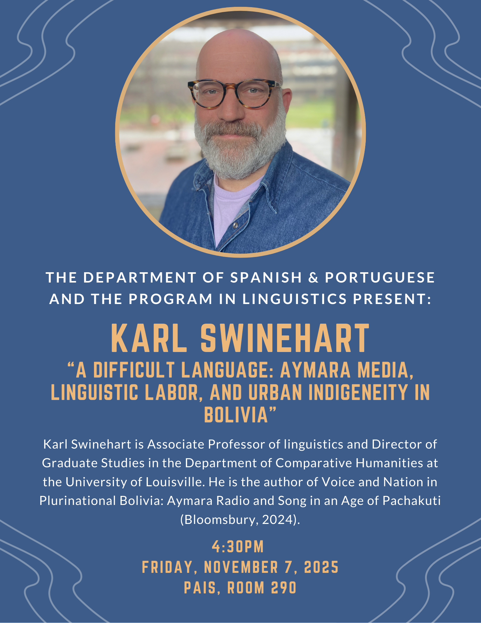 Dr. Karl Swinehart, Associate Professor of Linguistics at the University of Louisville, will give a talk on November 7th at 4:30pm in PAIS 290 on "A Difficult Language: Aymara Media, Linguistic Labor, and Urban Indigeneity in Bolivia."